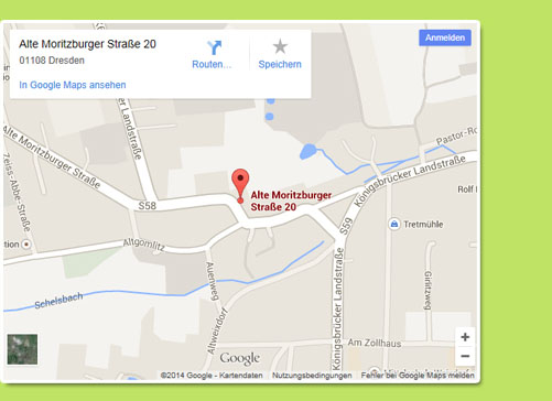 Anfahrt Unsere Kanzlei liegt im Norden von Dresden. Falls Sie uns über die Autobahn erreichen möchten, kommen Sie am schnellsten über die Anschlussstelle "Marsdorf" auf der A13 und dann weiter in Richtung Dresden-Weixdorf. |